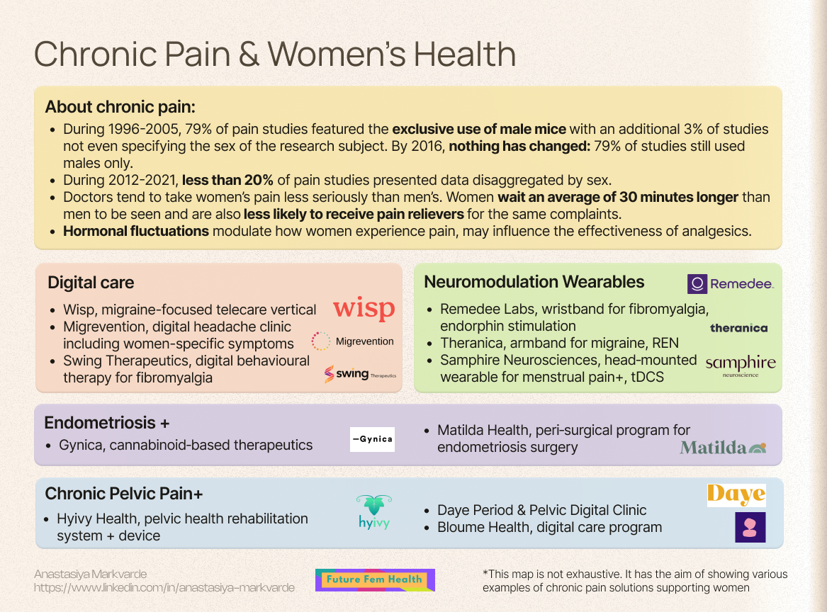 Below are some examples of startups supporting patients with chronic pain depending on the condition. While not all of them target women only, these solutions address women-specific symptoms or have done studies focused on women. They reflect a broader shift towards pain care that accounts for hormonal dynamics, life stage and female-dominant conditions.
