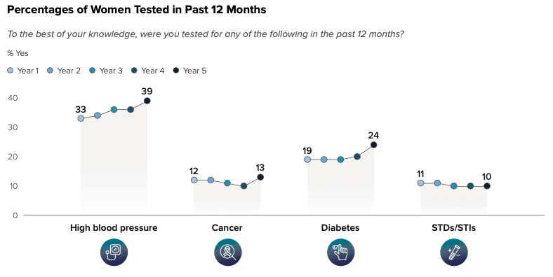 The Index shows that in the past year around 70 million more women were tested for cancer, high blood pressure or diabetes compared to the previous year. Screening rates for high blood pressure have reached 39%, while diabetes testing has climbed to 24%, both at record highs.