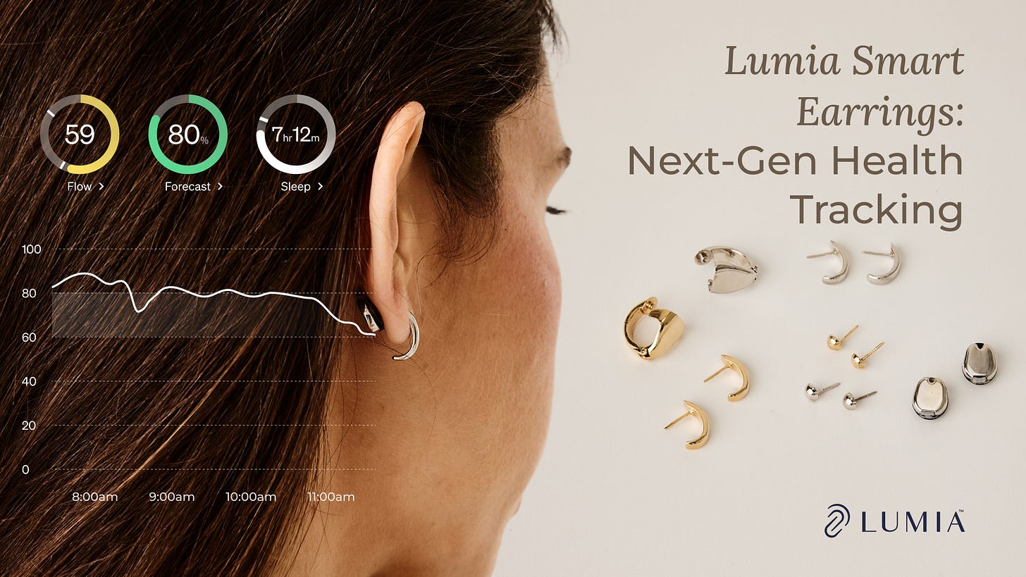 Lumia 2 is now live on Kickstarter: smart earrings that track 20+ health metrics including sleep, cycle, readiness, and temperature, indistinguishable from fine jewelry. Wear them as hoops, studs, or cuffs in gold, silver, and titanium or attach to almost any earring you already own. Limited quantities available.