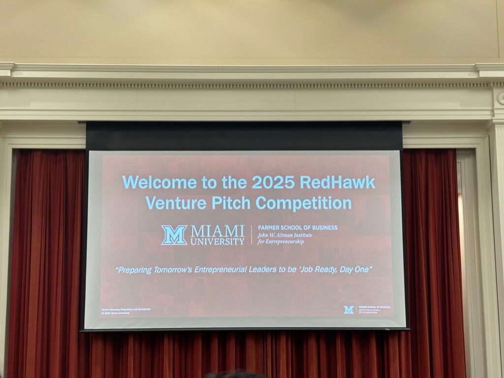 On December 4, 2025, the Farmer School of Business hosted the RedHawk Venture Pitch Competition. Participants were a part of the Entrepreneurship New Venture capstone and, throughout the semester, developed a product or service that proved to solve a problem, was marketable and had viable financial predictions so we could inevitably present to real-world investors.