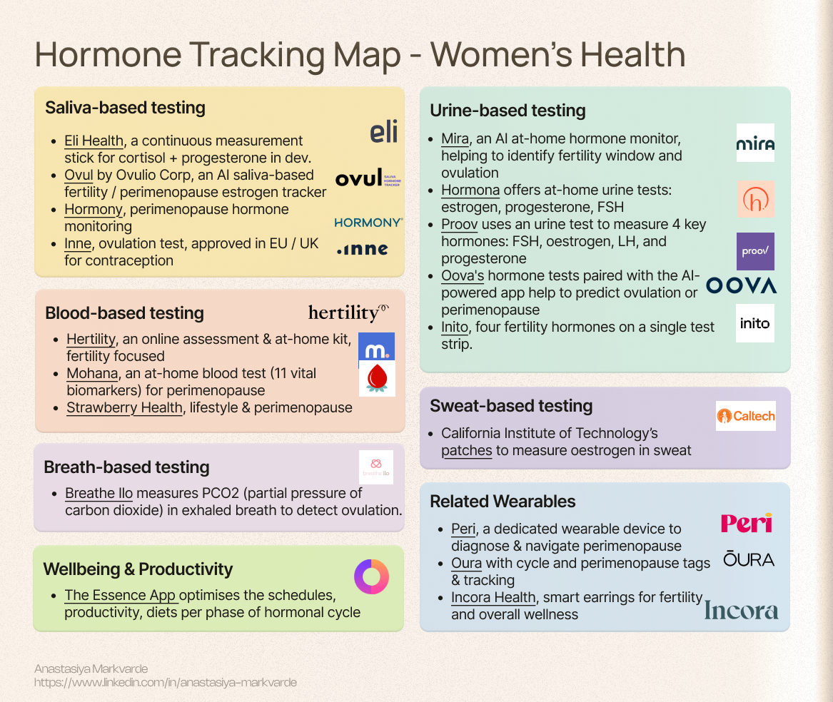 To address this vast women’s hormonal health gap, innovative solutions are emerging. Startups in the area are allowing women to track previously inaccessible data. At-home tests have experienced rapid growth, while the emerging and most transformative shift is towards continuous or high-frequency tracking - these are technologies capable of capturing hormone dynamics in real time, not just snapshots.